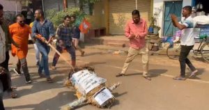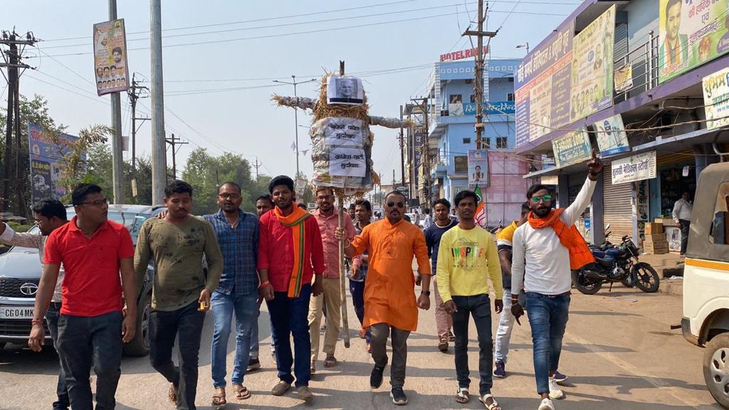 आरंग(29.01.23)- बिलासपुर जिले के तखतपुर में अभाविप द्वारा आयोजित छात्र सम्मेलन में कांग्रेस पार्टी की स्थानीय विधायक रश्मि सिंह के नेतृत्व में कांग्रेसी कार्यकर्ताओ के द्वारा अभाविप कार्यकर्ता से हुए मारपीट तथा हिंसा के विरोध में भाजयुमो आरंग मंडल द्वारा मंडल अध्यक्ष रितेश साहू के नेतृत्व में कॉलेज चौक से पैदल मार्च निकालकर महामाया पारा के पास कांग्रेस सरकार का पुतला दहन किया गया ।