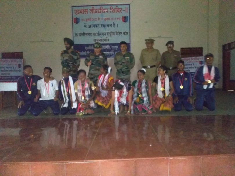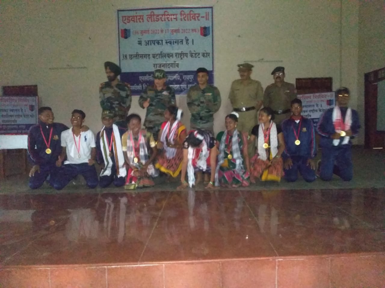 आरंग: एनसीसी प्रशिक्षण अकादमी, लखोली रायपुर में आयोजित एनसीसी के एडवांस लीडरशिप कैंप का आज समापन समारोह हुआ। इस अवसर पर रंगारंग सांस्कृतिक कार्यक्रमों का आयोजन हुआ। उड़ीसा आंध्र प्रदेश मध्यप्रदेश एवं छत्तीसगढ़ के एनसीसी कैडेट्स ने सांस्कृतिक कार्यक्रमों में संपूर्ण भारतवर्ष के त्यौहारों एवं परंपराओं को दिखाया। कैंप की समस्त गतिविधियों जैसे ग्रुप डिस्कशन में बेस्ट प्रेजेंटेशन, कविता पाठ तथा खो-खो वालीबाल आदि क्रीड़ा स्पर्धाओं में उत्कृष्ट स्थान प्राप्त कैडेटों को पुरस्कृत किया गया। कैंप के विभिन्न अप्वाइंटमेंट्स को भी मैडल प्रदान किए गये।