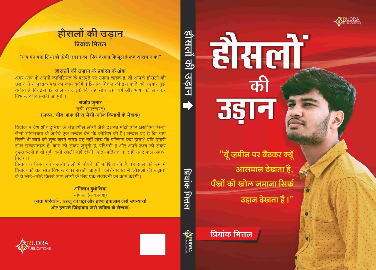 जशपुर जिले के कांसाबेल ब्लॉक में रहने वाले प्रियांक मित्तल ने लिखी प्रेरणादायी किताब “हौसलों की उड़ान”। युवा लेखक प्रियांक मित्तल अभी 1st ईयर कॉलेज में हैं। दरअसल यह किताब प्रियंक ने अपने स्कूल में लिखनी शुरू कर दी थी। प्रियंका कहना है कि जितने समय मुझे लिखने में लगा उससे ज्यादा समय मुझे सफलता प्राप्त किए हुए व्यक्तियों द्वारा किए गए संघर्षों के बारे में जानने और उनकी जीवन शैली को परखने मैं लगा। प्रियांक के विद्यालय में एक दसवीं क्लास के बच्चे द्वारा परीक्षा में नंबर कम आने पर आत्महत्या कर ली थी। इस घटना ने प्रियांक को झकझोर दिया, तब प्रियांक 9 वीं कक्षा के छात्र थे और तब से ही उन्होंने एक प्रेरणादायी किताब लिखने की ठान ली थी। इस किताब में बड़े-बड़े कामयाब चेहरों की संघर्ष के दिनों के बारे में लिखा गया है, इस किताब में बताया गया है कि बिना संघर्ष जिंदगी में कुछ भी नही मिलता और संघर्ष से डर कर जो हर नहीं मानते सफलता उनके ही कदम चूमती है। इस किताब में जशपुर के बगीचा से विश्व प्रसिद्ध मॉडल रेनी कुजुर के भी संघर्षों के बारे में बताया गया है। प्रियांक का कहना है कि हमें किसी भी सफल व्यक्ति की सफलता से पहले उस मुकाम तक पहुँचने के लिए उन्होंने जो संघर्ष किये हैं वो जानना बहुत जरूरी है। प्रियांक कहते हैं की वे अपने कलम के माध्यम से देश मे बढ़ रही आत्महत्या की घटनाओं को रोकने के लिए जितना हो सके प्रयास करेंगे। इस किताब “हौसलों की उड़ान” में मुख्यतः जीवन मे कभी न हार मानने वाले व्यक्तियों के शुरुआती संघर्ष की कहानियां हैं।