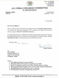 आरंग: प्रदेश कांग्रेस कमेटी अनुसूचित जाति विभाग के प्रदेश उपाध्यक्ष और आरंग जनपद सदस्य प्रतिनिधि पिंटू कुर्रे को आगामी हरियाणा विधानसभा चुनाव में बड़ी जिम्मेदारी मिली है।अखिल भारतीय कांग्रेस कमेटी अनुसूचित जाति विभाग के राष्ट्रीय अध्यक्ष राजेश लिलोठिया ने हरियाणा विधानसभा चुनाव में रेवाड़ी विधानसभा सीट से चुनाव प्रचार के लिए ऑब्जर्वर (पर्यवेक्षक) नियुक्त किया है। वे हरियाणा के प्रदेश अध्यक्ष सहित सभी प्रमुख नेताओं के साथ समन्वय बनाकर अपने कर्तव्य का निर्वहन करेंगे।इसके अलावा वे एससी विभाग हरियाणा पीसीसी और कांग्रेस उम्मीदवार के लिए वोट जुटाने में सहयोग करेंगे।