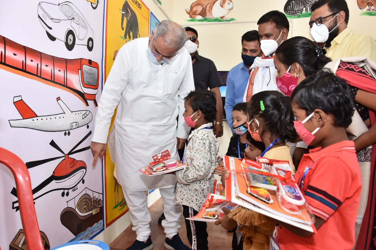 पहुंचकर निरीक्षण किया। उन्होंने इस दौरान वहां बच्चों से रू-ब-रू होते हुए आंगनबाड़ी केन्द्र के ब्लैक बोर्ड पर ‘बच्चे सबसे अच्छे‘ लिखकर उनका हौसला बढ़ाया। यह अवसर था वेदांता समूह के सहयोग से दुर्ग जिले के पाटन विधानसभा क्षेत्र में 101 आंगनबाड़ी केंद्रों के रेनोवेशन पश्चात् लोकार्पण का।
