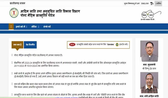 सत्र 2023-24 के लिए अनुसूचित जनजाति, अनुसूचित जाति एवं अन्य पिछड़ा वर्ग के लिए पोस्ट मैट्रिक छात्रवृत्ति योजना के लिए ऑनलाइन आवेदन (नवीन एवं नवीनीकरण ) की तिथि बढ़ा दी गई है। यह 15 जनवरी 2024 तक निर्धारित की गई है। पंजीयन स्वीकृति एवं वितरण की कार्यवाही ऑनलाईन होगी, जिसके लिए वेबसाइट http://postmatric.scholarship.cg.inc.in/ है।