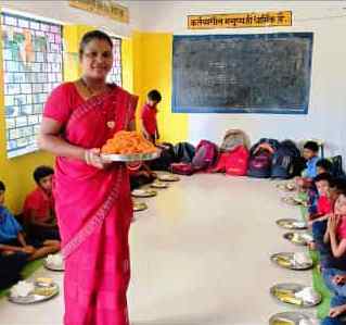टांगर गांव कांसाबेल की प्रधान पाठक श्रीमती सकुन्तला बाई चौहान ने बच्चों को कराया न्योता भोजन