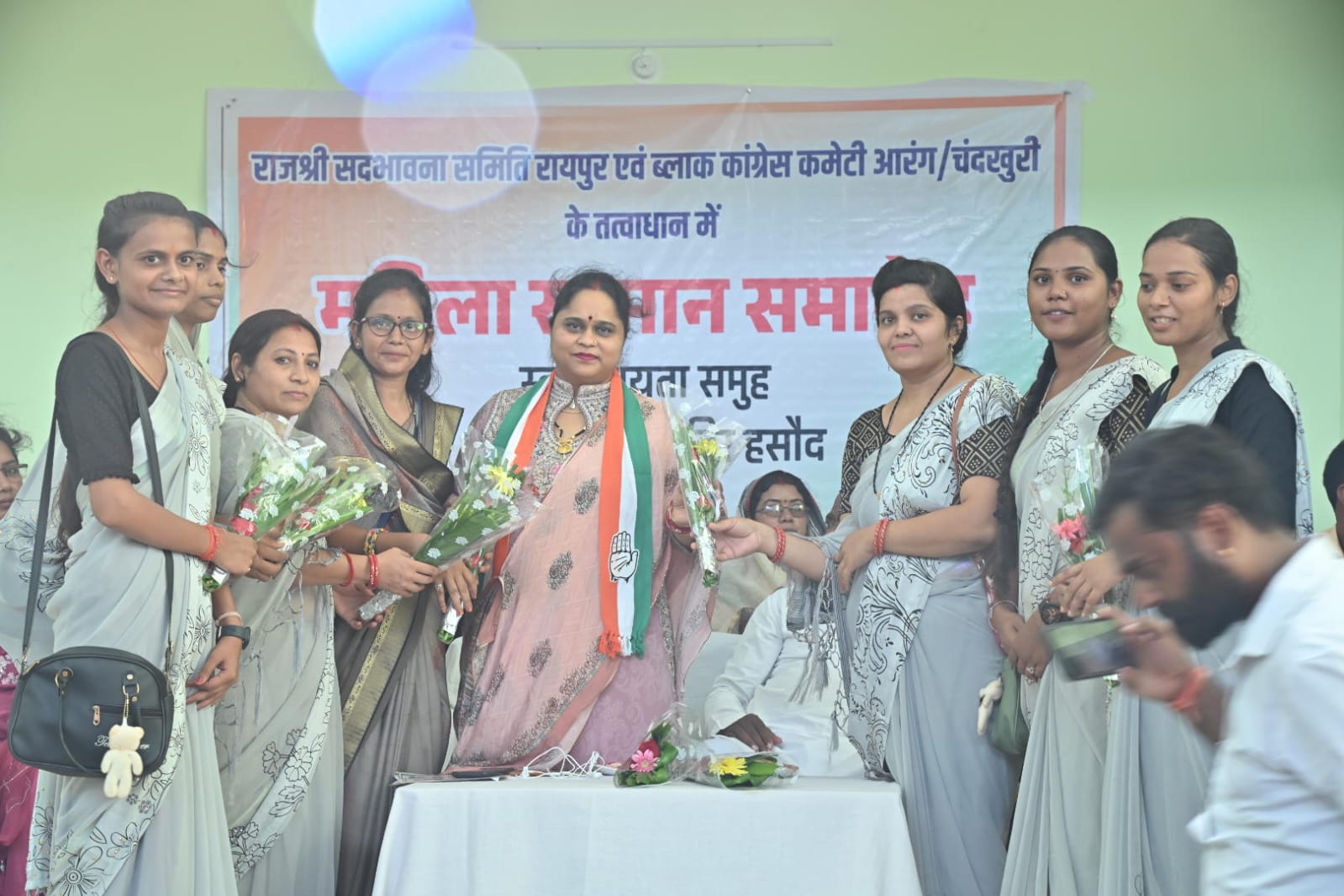 आरंग/ 06 अक्टूबर 2023/ कांग्रेस की भूपेश सरकार में महिलाओं के उत्थान के लिये विभिन्न हितकारी योजना चलाकर उनके जीवन स्तर को बेहतर बनाने का कार्य किया जा रहा है। महिला समूह को शासन के द्वारा आर्थिक सहायता देकर उन्हें स्वरोजगार स्थापित करने के लिये प्रेरित भी किया जा रहा है। जिससे प्रेरित होकर ग्रामीण एवं शहरी क्षेत्र की महिला समूह स्वयं का रोजगार स्थापित कर आर्थिक लाभ लें रही हैं साथ ही अन्य के लिये भी मार्गदर्शक का भी काम कर रहीं हैं। इन्हीं महिलाओं को उनके परिश्रम एवं स्वयं के बल पर स्वरोगार स्थापित करने के कारण क्षेत्रीय विधायक एवं श्रम मंत्री डॉ. शिवकुमार डहरिया जी अपने विधानसभा क्षेत्र के स्व सहायता समूह के महिलाओं को उनके कार्यों के लिये प्रोत्साहित कर उन्हें सम्मानित कर रहें हैं। इसी कड़ी में राजश्री सद्भावाना समिति रायपुर एवं ब्लाक कांग्रेस कमेटी आरंग, चंदखुरी के संयुक्त तत्वाधान में नगरपालिका मंदिरहसौद एवं नगर पंचायत चंदखुरी में महिला सम्मान समारोह का आयोजन किया गया। जिसमें मुख्य अतिथि शकुन शिवकुमार डहरिया अध्यक्ष राजश्री सद्भावना समिति रायपुर व सदस्य प्रदेश कांग्रेस कार्यसमिति, प्रभारी अजा. विभाग एवं प्रदेश महिला कांग्रेस के द्वारा महिलाओं को स्वरोजगार की दिशा में अच्छा कार्य करने लिये सम्मानित किया। इस अवसर पर प्रमुख रूप से द्वारिका साहू संचालक अपैक्स बैंक, खिलेश्वर देवांगन अध्यक्ष जनपद पंचायत आरंग, कोमल सिंह साहू अध्यक्ष ब्लाक कांग्रेस कमेटी आरंग, केशरी मोहन साहू जिलाध्यक्ष महिला कंाग्रेस रायपुर ग्रामीण, ओमप्रकाश यादव पूर्व अध्यक्ष नपा. मंदिर हसौद, रविशंकर धीवर पूर्व अध्यक्ष नपा. चंदखुरी, दिनेश ठाकुर महामंत्री जिला कांग्रेस रायपुर ग्रामीण, शारदा देवी वर्मा पूर्व अध्यक्ष जिला पंचायत रायपुर, सौरभ चन्द्राकर,निखिल वर्मा, मयंक तिवारी, प्रेमशंकर यदु, हेमंत कोटराने, चेतन वर्मा, संतोष वर्मा, मोंगरा चौहान, कृष्णा साहू, संतोष सिंहा, दिलीप जोशी, प्रेमनारायण मिश्रा, अंजू बघेल,