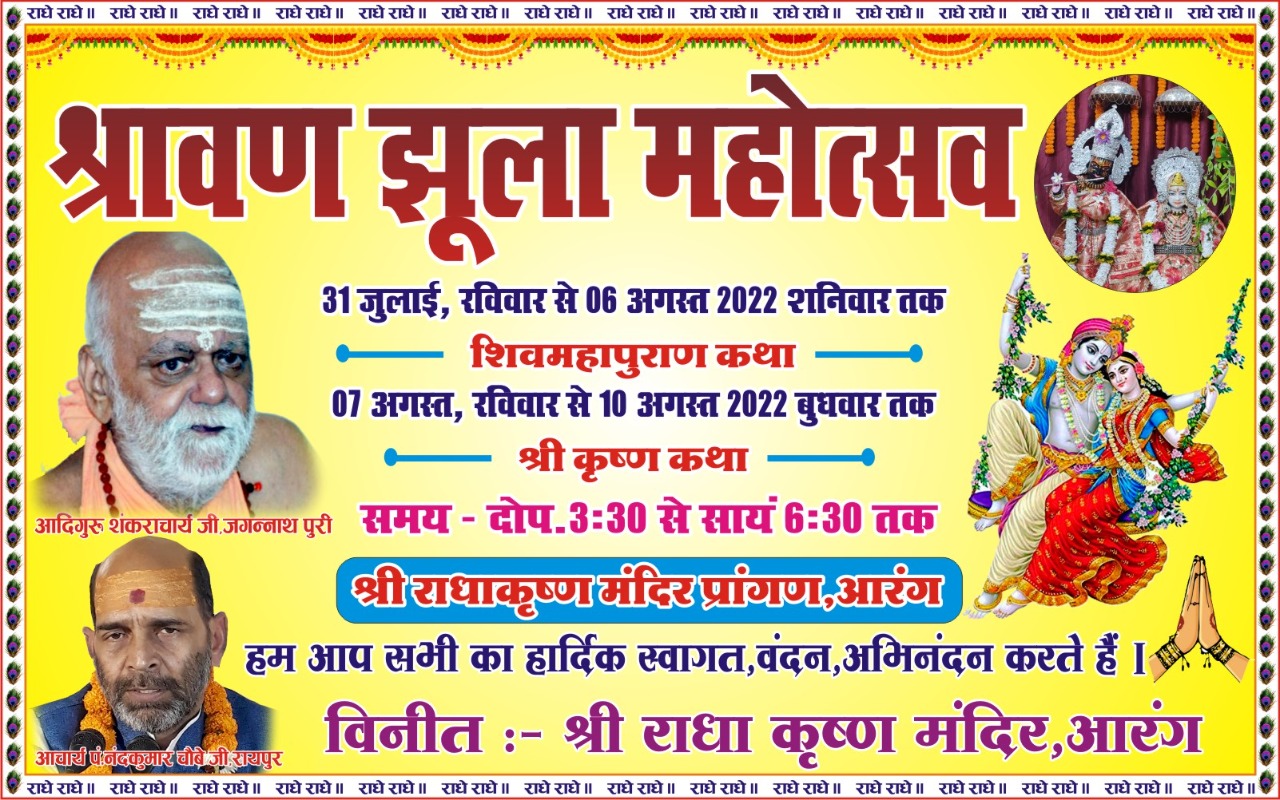 आरंग(30.07.22)- प्रतिवर्ष अनुसार इस वर्ष भी राधाकृष्ण मंदिर में 31 जुलाई से 10 अगस्त तक 11 दिवसीय श्रावण झूला महोत्सव मनाया जावेगा। इस अवसर पर प्रतिदिन 12 से 2 बजे तक शिव जी का रुद्राभिषेक होगा, अभिषेक में निःशुल्क बैठने के इच्छुक श्रद्धालु मंदिर में संपर्क कर सकते हैं। साथ ही 31 जुलाई से 6 अगस्त तक शिव महापुराण कथा एवं 7 से 10 अगस्त तक श्रीकृष्ण कथा प्रवचन कथावाचक नंद कुमार चौबे रायपुर वाले के द्वारा किया जावेगा।