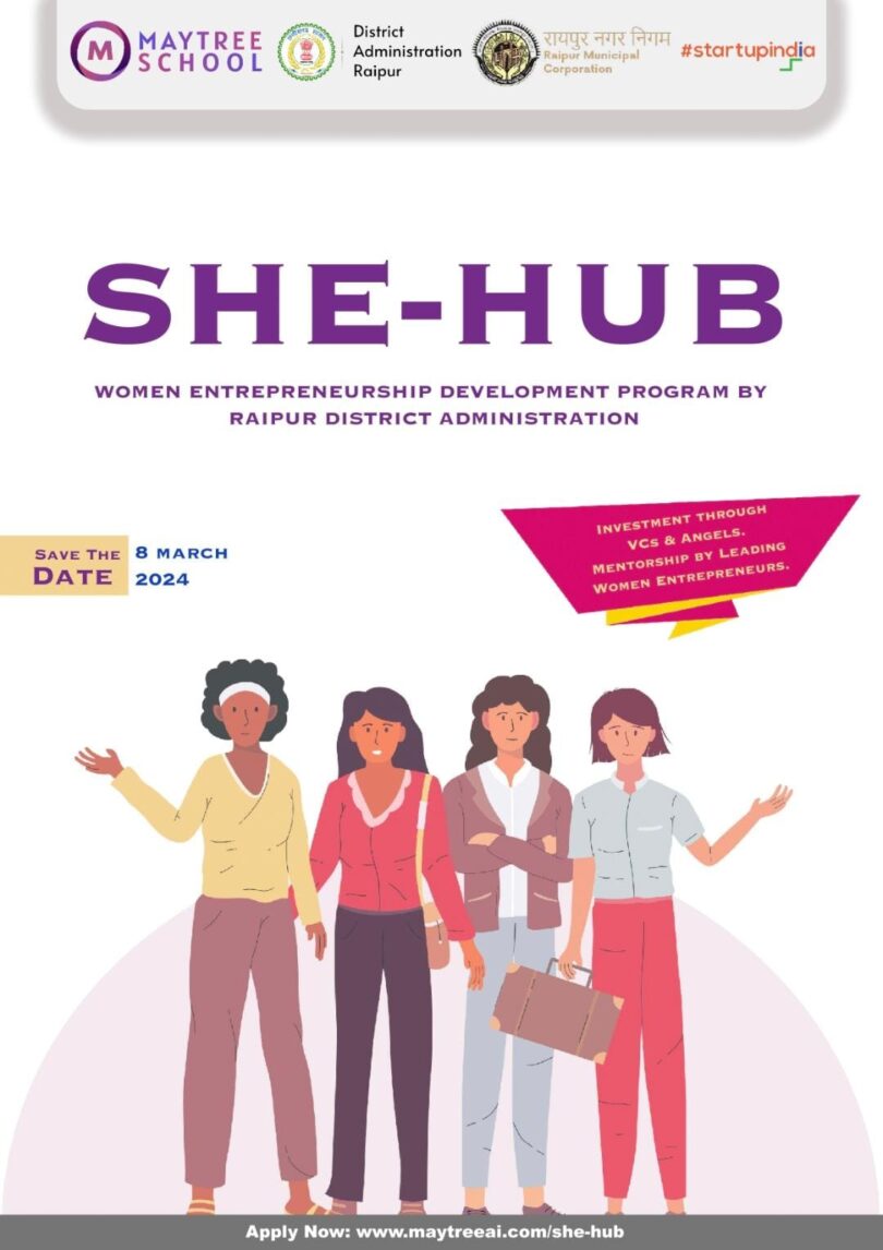 रायपुर 9मार्च 2024।मुख्यमंत्री श्री विष्णुदेव साय के मंशानुरूप महिला उद्यमिता को बढ़ावा देने रायपुर जिला प्रशासन मैत्रिय स्कूल के साथ मिलकर “She Hub” कार्यक्रम प्रारंभ कर रहा है। इस कार्यक्रम के अंतर्गत “जीरो से वन” फॉर्मूला के आधार पर महिला उद्यमियों के लिए गतिवर्धक कार्यक्रम संचालित हो रहा है । उद्यमिता से जुड़ी महिलाएँ https://maytreeai.com/she-hub/ लिंक पर अपना आवेदन कर इस कार्यक्रम से जुड़ सकते हैं ।