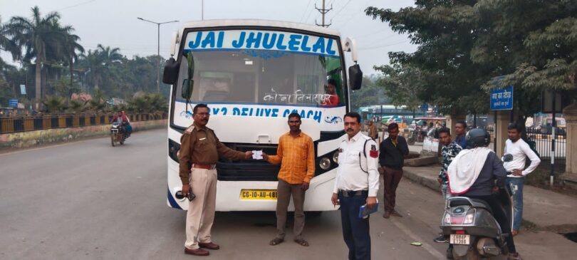 रायपुर _______@ आपको बता दे की भाठागांव में अंतर्राज्यीय बस स्टैंड का निर्माण किया गया है जहां से रायपुर शहर से सभी शहरों में बसों का संचालन हो रहा है जिसमें बसों के प्रवेश एवं निर्गम हेतु पृथक पृथक गेट बनाए गए हैं, बस संचालकों का बैठक लेकर निर्देश दिया गया था कि बस स्टैंड के भीतर ही सवारी बैठाएंगे एवं उतारेंगे और ना ही आम रोड पर खड़ा कर सवारी भरने का कार्य करेंगे। बस संचालकों के द्वारा बस स्टैंड गेट नंबर 1 एवं 2 के सामने रोड पर खड़ी कर सवारी बिठाने का कार्य कर रहे थे जिससे यातायात बाधित हो रहा था जिसकी शिकायत मिलने पर वरिष्ठ पुलिस अधीक्षक रायपुर के निर्देशन पर श्री सचिंद्र कुमार चौबे अतिरिक्त पुलिस अधीक्षक यातायात रायपुर के मार्गदर्शन में श्री कर्ण कुमार उके , श्री सुशांतो बनर्जी एवं श्री गुरजीत सिंह उप पुलिस अधीक्षक यातायात रायपुर के नेतृत्व में यातायात थाना प्रभारी भाठागांव बस स्टैंड के द्वारा दिनांक 26 दिसंबर 2023 को बस स्टैंड गेट नंबर 1 और 2 तथा भाठागांव गांव चौक पर वाहन रोककर यात्री बैठाने वाले 42 बस चालकों पर कार्यवाही कर 32400₹ जुर्माना वसूल किया गया एवं बस चालकों को बस स्टैंड के अंदर सवारी बैठाने एवं उतारने निर्देश दिए गए।